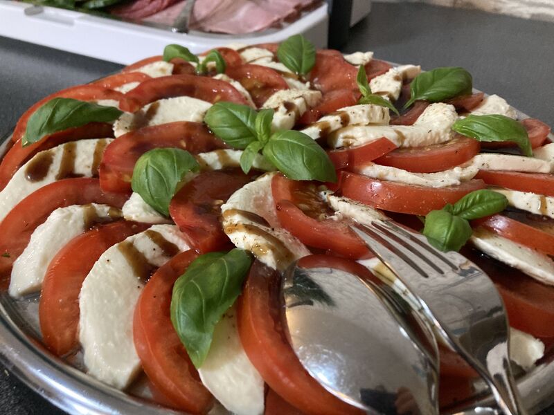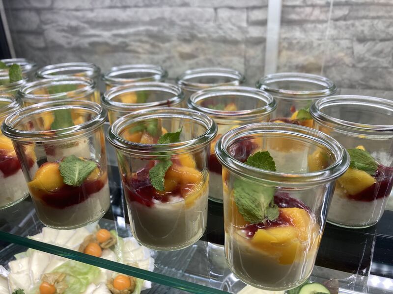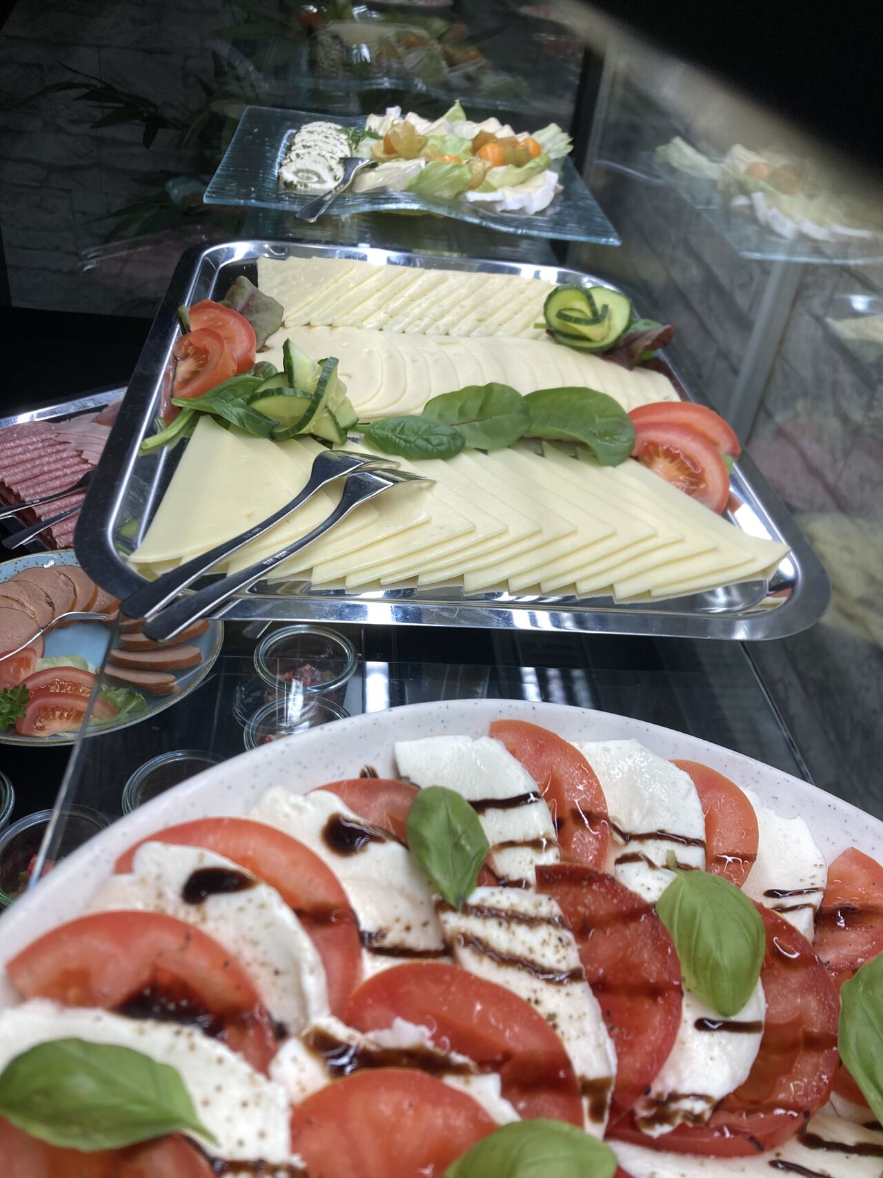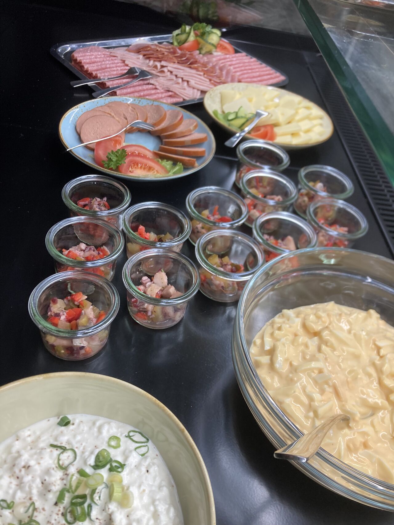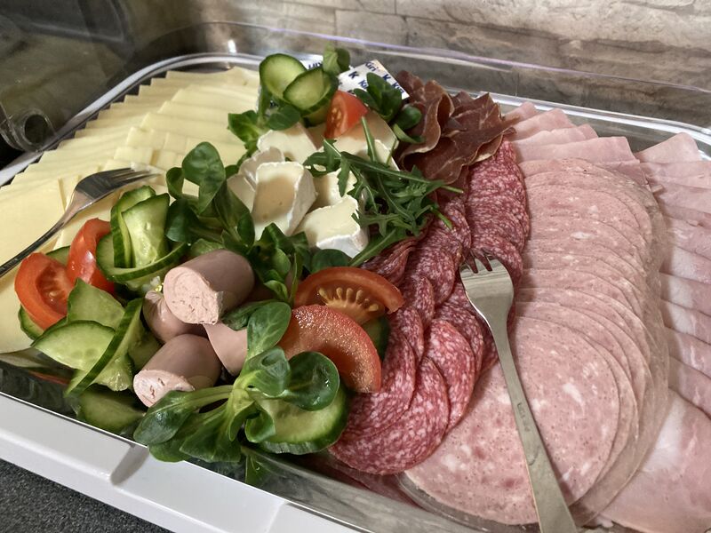 mit Brötchen, Aufschnitt, Butter, Marmeladen, Eier-, Wurst- und Matjessalat, warme Eierspeisen, Speck und Grillgemüse